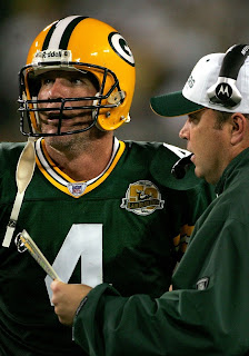 We weren't out-played by the Eagles by any stretch, it was a sloppy game that either game could have won. And despite the final score the game against the Giants, it could have been a lot closer or even a loss. Remember, it was 14-13 at the start of the fourth quarter. Favre continues a methodical drive that started from their own 20, with 4:22 left in the third quarter. It was just a perfect drive -- Favre goes 8-for-8, hitting four different guys, and caps it off with a short pass to Donald Lee for the score to make it 21-13. Nice.